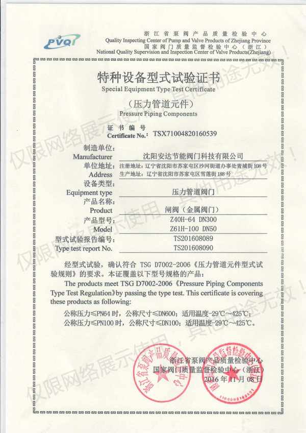 安達(dá)閥門特種設(shè)備型式實驗證書